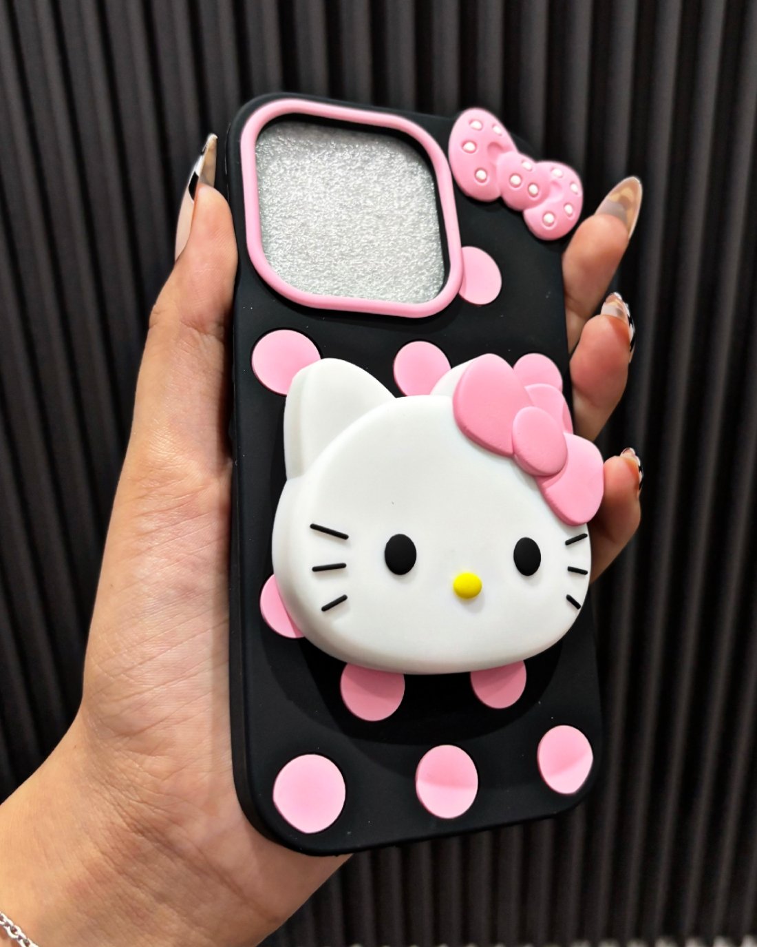This fun cover features a gorgeous 3D Hello Kitty face and an extra bow charm against a classic black and pink polka dot background. The soft, premium silicone material provides excellent shock-absorption to protect your phone from bumps and drops.