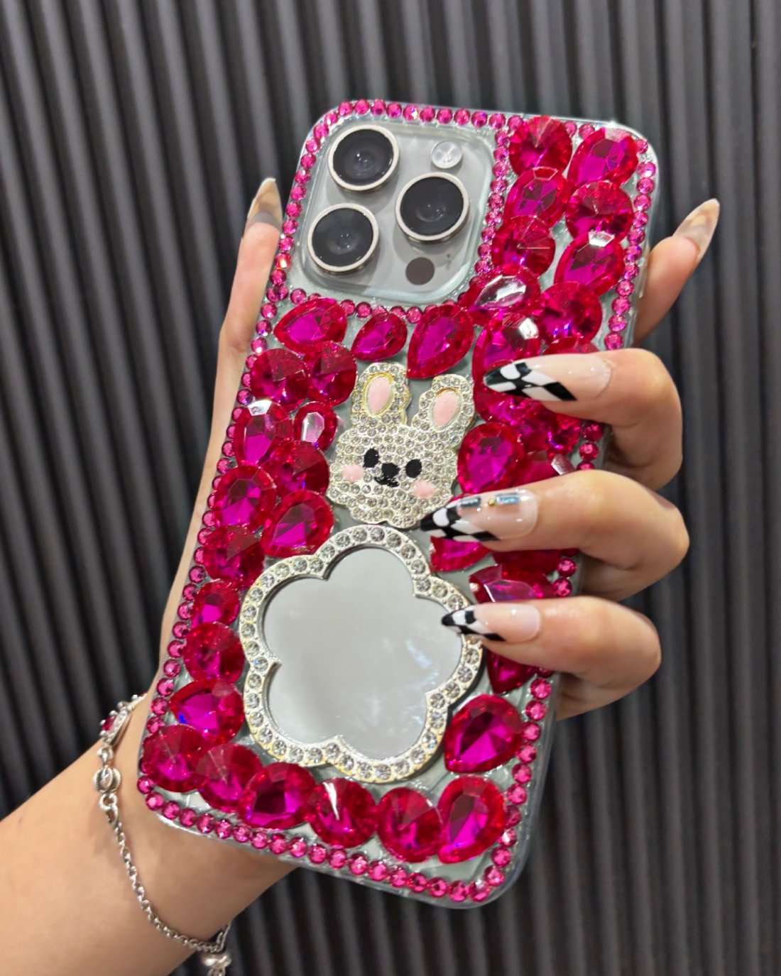 Each piece in this collection includes a unique, handcrafted centerpiece, such as a shimmering Pearl Mandala, a detailed Bunny Mirror, or a delicate Opal Flower, ensuring your phone stands out from the crowd.